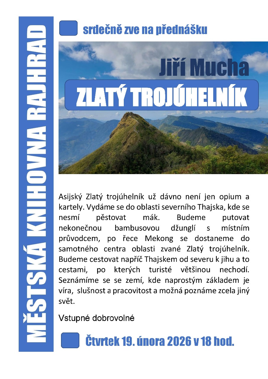 Zlatý trojúhelník 19.02.2026 18:00 Oblíbený cestovatel a vypravěč Jiří Mucha představí asijskou oblast zvanou ZLATÝ TROJÚHELNÍK plakát