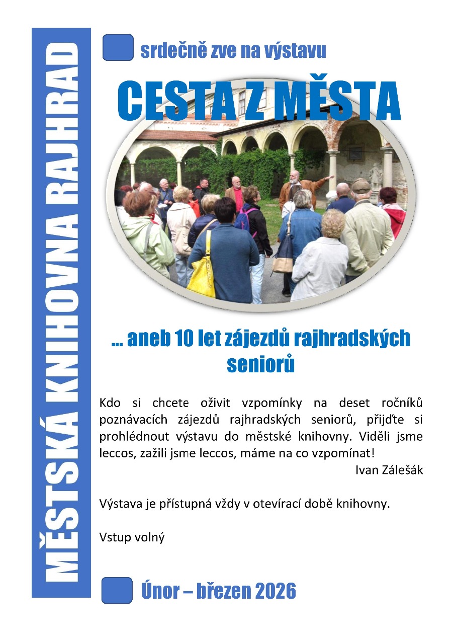 Cesta z města 12.02.2026 00:00 přijměte pozvání k ohlédnutí za cestami rajhradských seniorů v minulém desetiletí organizovaném městem Rajhrad plakát
